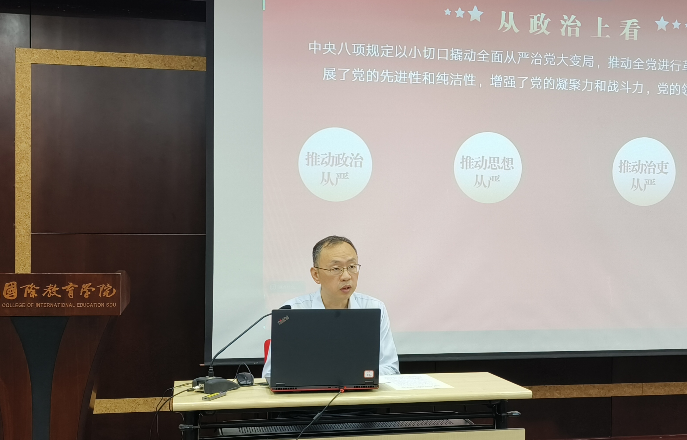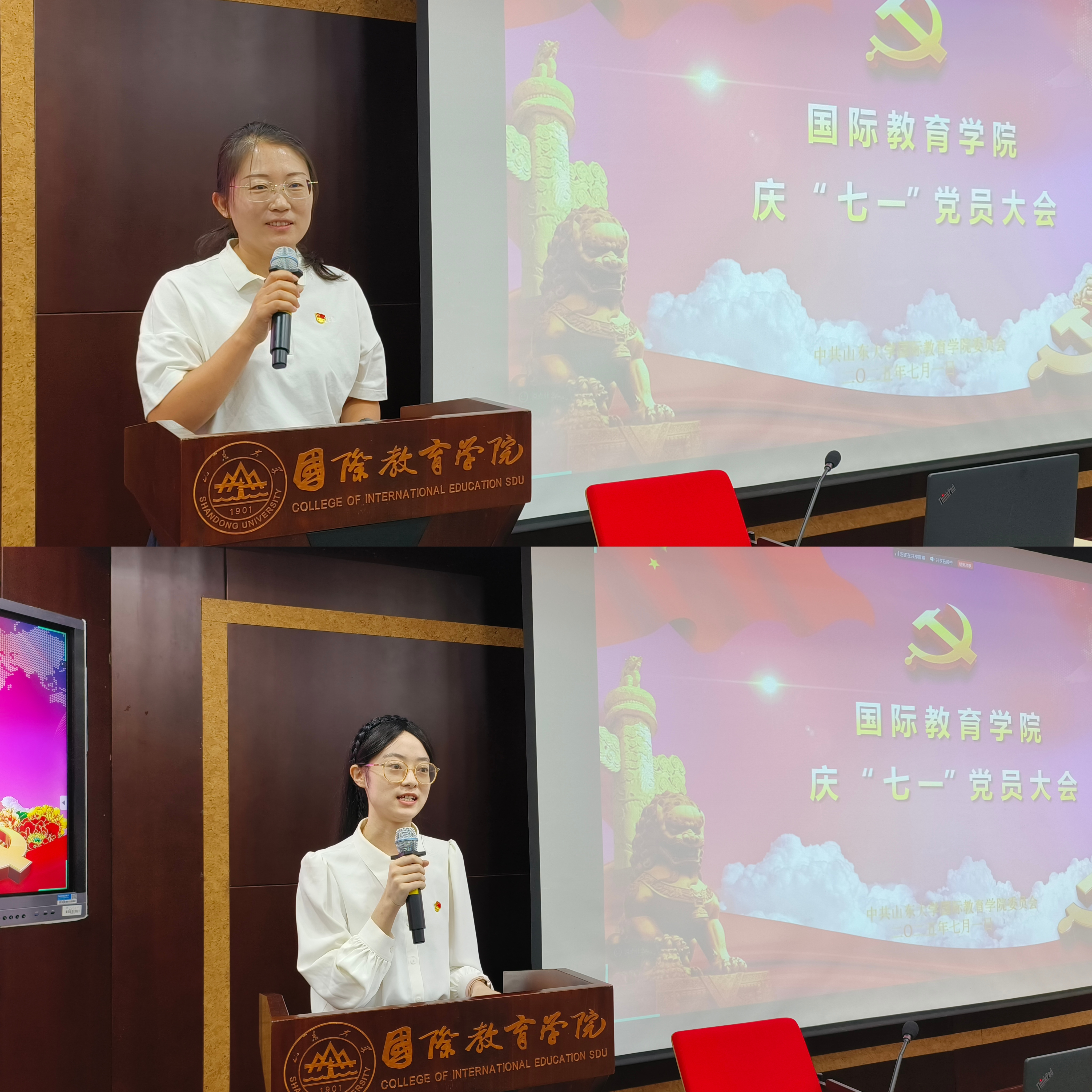 7月1日上午,学院召开庆“七一”党员大会,学院全体师生党员齐聚一楼报告厅,共同庆祝中国共产党成立104周年。国际教育学院党委书记姬锐以“八项规定改变中国”为主题讲授专题党课。会议由学院党委委员、副院长杜文倩主持。