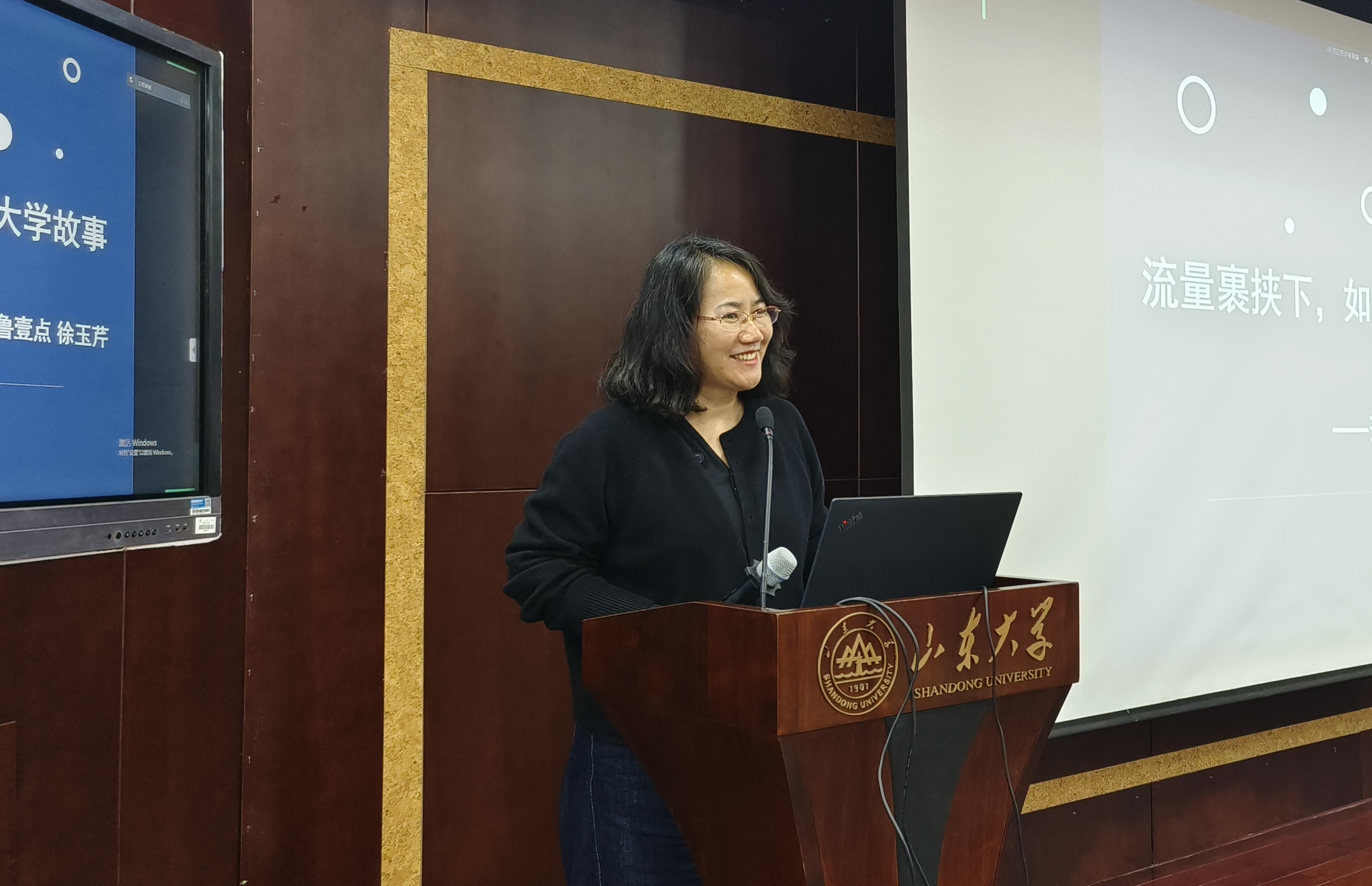 10月23日下午,学院党委举办“融跃计划”系列培训第三场专题讲座。齐鲁晚报教育数据应用与传播研究中心主任、山东资深教育记者徐玉芹以“流量裹挟下,如何讲好大学故事”为主题,为师生党员做教育传播素养专题辅导。学院党委书记姬锐主持讲座。
