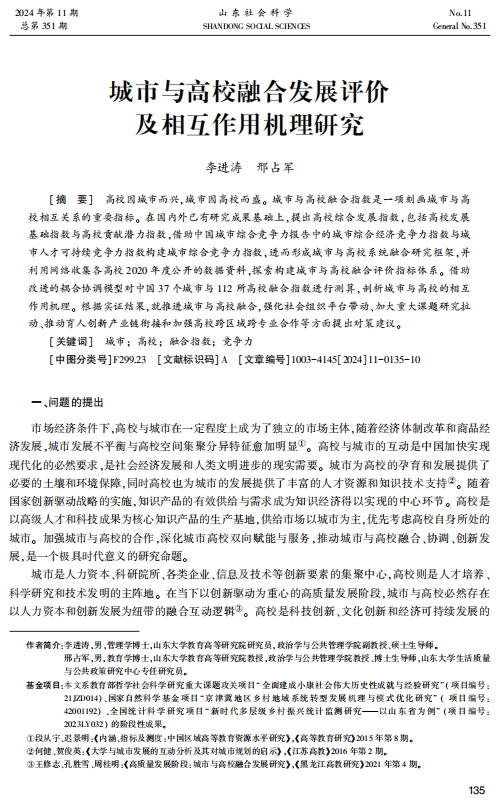 李进涛研究员和邢占军教授在《山东社会科学》2024年第11期发表题为《城市与高校融合发展评价及相互作用机理研究》的学术论文。