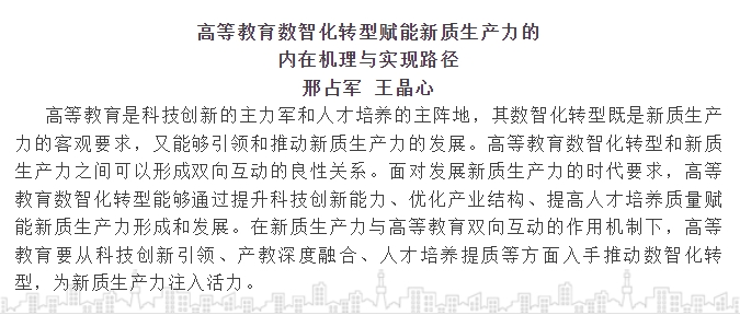 邢占军教授和王晶心助理研究员在《南京社会科学》2024年第12期发表题为《高等教育数智化转型赋能新质生产力的内在机理与实现路径》的学术论文。