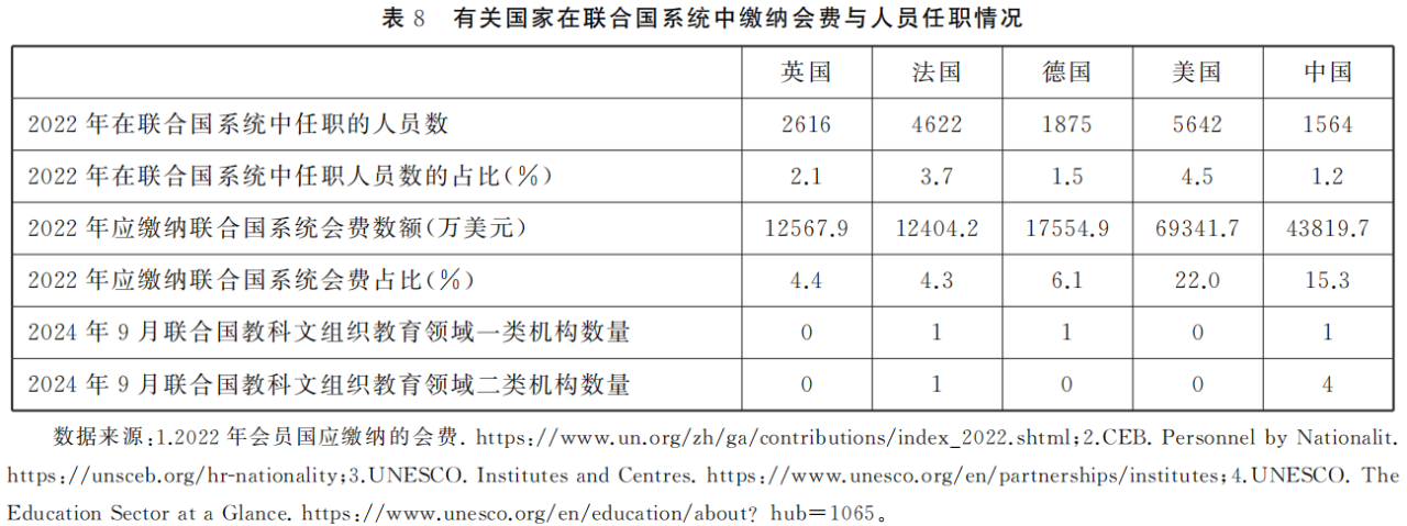 在全球治理层面,国际组织是全球治理的重要载体,而主权国家在国际组织内发挥影响力的根本媒介是国际组织人才。[19]联合国作为世界上规模最大、最重要的政府间国际组织,是促进国际合作、推动全球治理的关键平台,其各项事务涉及的议题涵盖国际政治、安全、经济、教育等众多方面。因此,本研究选取了“在联合国系统中任职人员数”、“联合国系统会费数额及其占比”、“教育领域一类机构和二类机构数量”⑤三个指标,既反映一国在全球教育治理中的参与度,也反映其整体的全球治理能力。