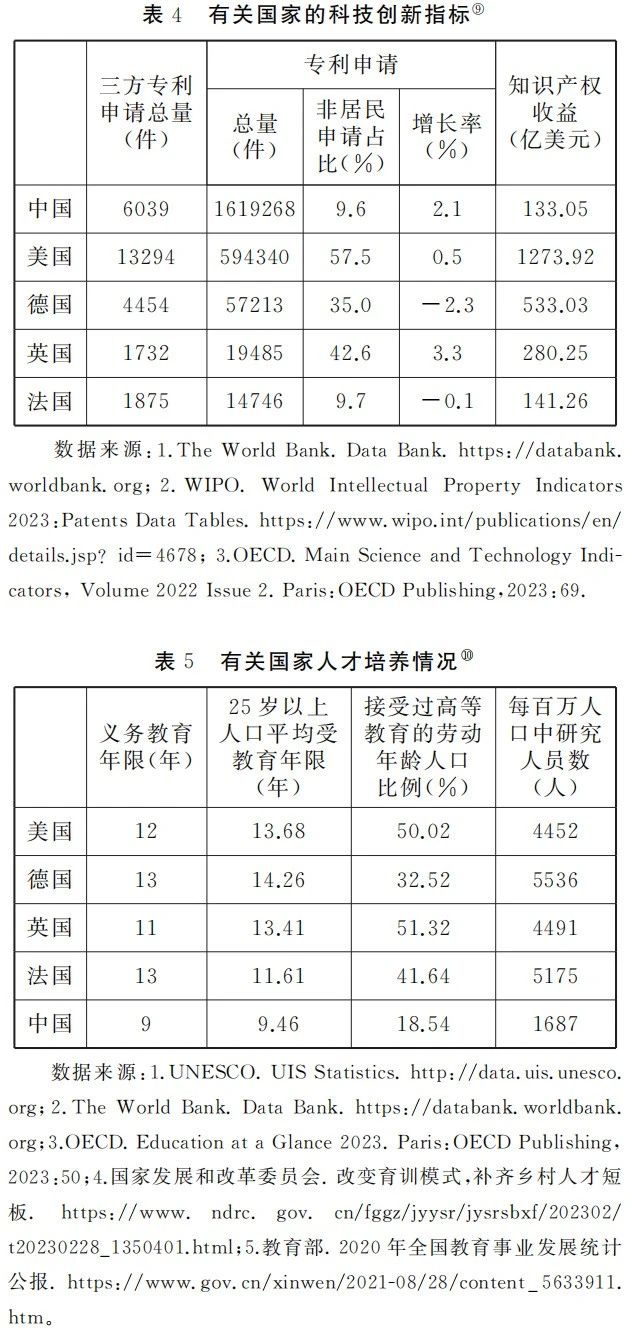 ⑩在人才培养指标中,“义务教育年限”为2023年的数据;“25岁以上人口平均受教育年限”除法国为2019年的数据以外,其他国家为2020年数据;各国“接受过高等教育的劳动年龄人口比例”数据的年份均为2022年;“每百万人口中研究人员数”除美国为2020的数据、英国为2017的数据以外,其他国家均为2021年的数据。