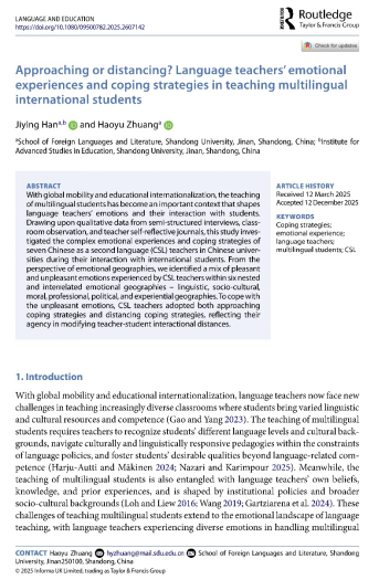 双聘教授韩佶颖在教育学与教育研究领域、语言学领域SSCI一区期刊《LanguageandEducation》发表题为“Approaching or distancing? Language teachers’ emotional experiences and coping strategies in teaching multilingual international students”(“进度有度”——国际中文教师情绪体验与应对策略研究)的学术论文。